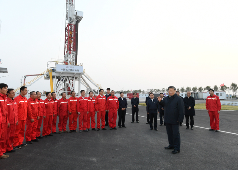 10月22日下午,中共中央總書記、國(guó)家主席、中央軍委主席習(xí)近平在山東省濟(jì)南市主持召開深入推動(dòng)黃河流域生態(tài)保護(hù)和高質(zhì)量發(fā)展座談會(huì)并發(fā)表重要講話。這是座談會(huì)前,習(xí)近平21日下午在位于東營(yíng)市萊州灣的勝利油田萊113區(qū)塊考察時(shí),同工人們親切交流。新華社記者 謝環(huán)馳 攝