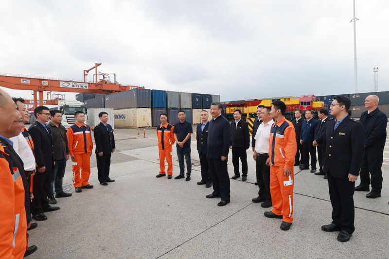 4月22日至24日,中共中央總書記、國家主席、中央軍委主席習(xí)近平在重慶考察。這是22日下午,習(xí)近平在重慶國際物流樞紐園區(qū)重慶鐵路集裝箱中心站,同貨車司機(jī)、列車司機(jī)、裝卸工人、場(chǎng)站管理人員等親切交流。新華社記者 王曄 攝