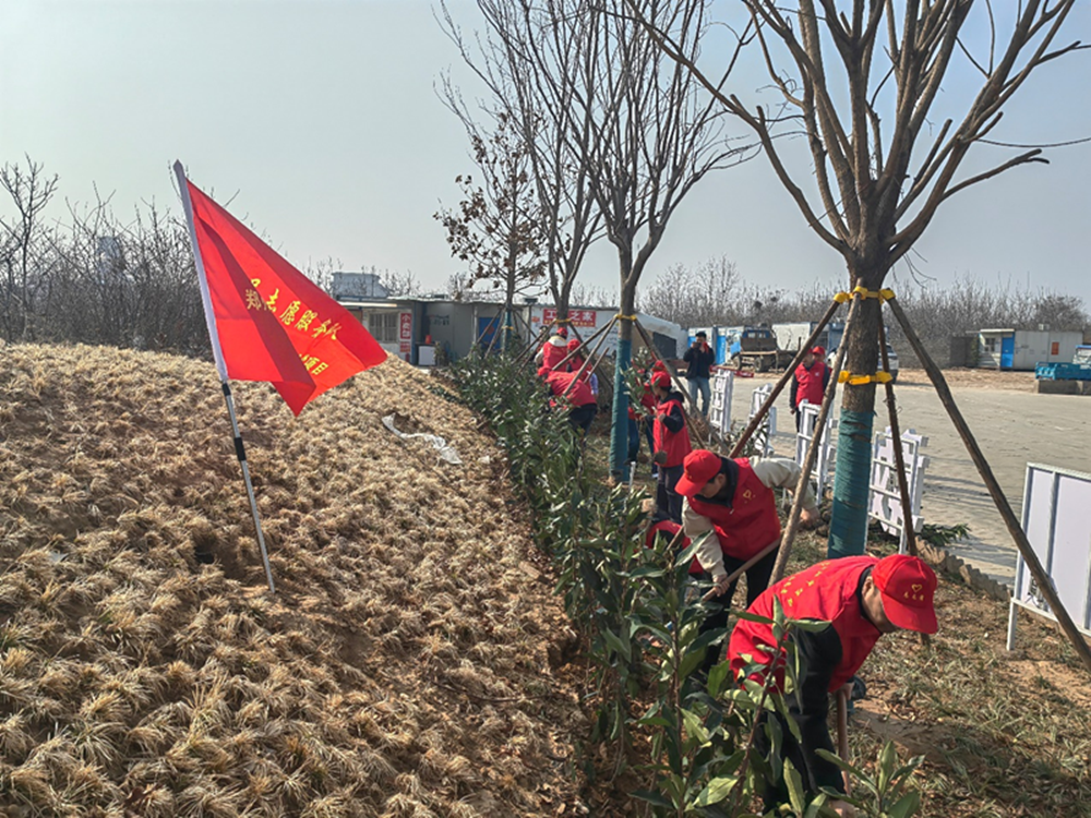 黨員志愿服務(wù)隊(duì)人員分工明確,配合默契。挖坑、搬運(yùn)、植樹、培土澆水,井井有條,忙而不亂。在志愿者的共同努力下,細(xì)心栽下碧綠的樹苗,在暖暖的陽光下格外顯眼,仿佛為項(xiàng)目披上一層新裝。