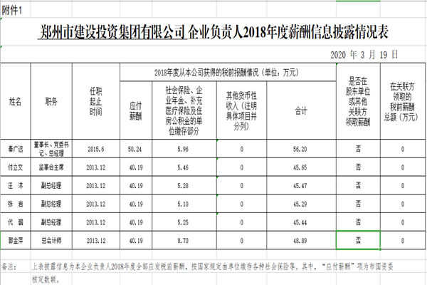 鄭州市建設(shè)投資集團(tuán)有限公司企業(yè)負(fù)責(zé)人2018年度薪酬信息披露情況表
